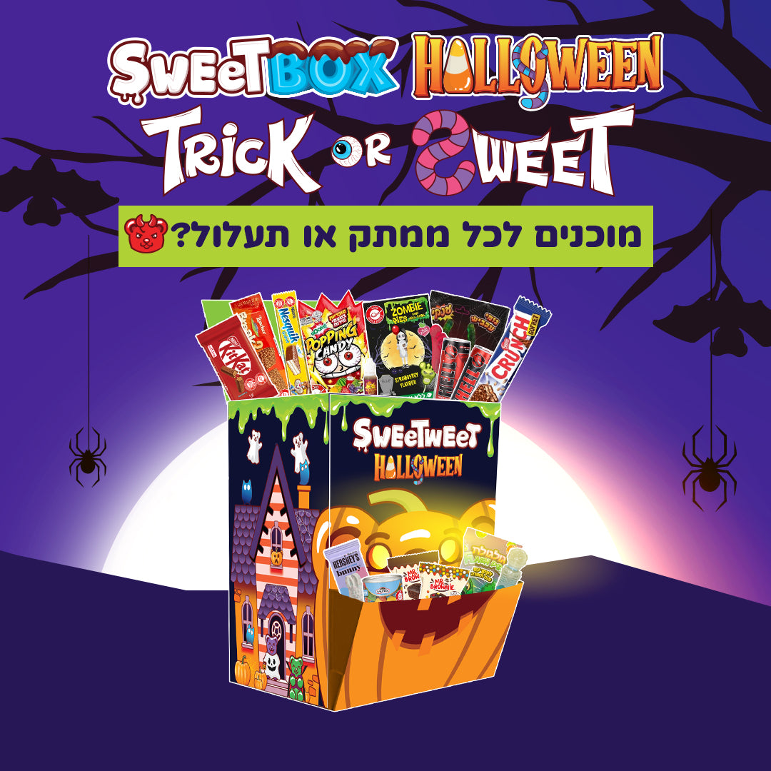 סוויטבוקס HALLOWEEN מתוק במיוחד עם 10 ממתקים שהם תעלולים ועוד 10 ממתקים שהם ממתקים שיעשו לכם מתוק ויכניסו אתכם לאווירת ליל כל הקדושים (או המתוקים).