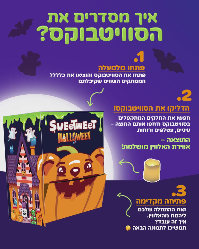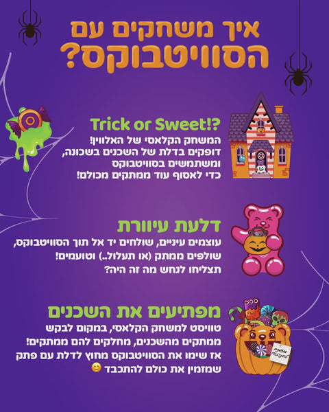 סוויטבוקס HALLOWEEN מתוק במיוחד עם 10 ממתקים שהם תעלולים ועוד 10 ממתקים שהם ממתקים שיעשו לכם מתוק ויכניסו אתכם לאווירת ליל כל הקדושים (או המתוקים).