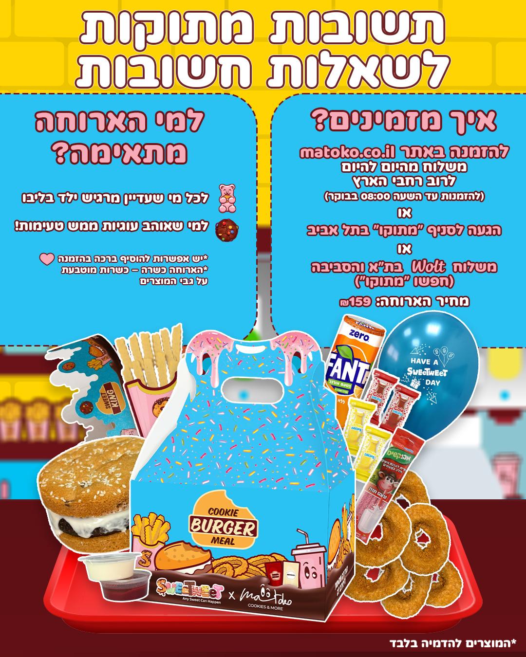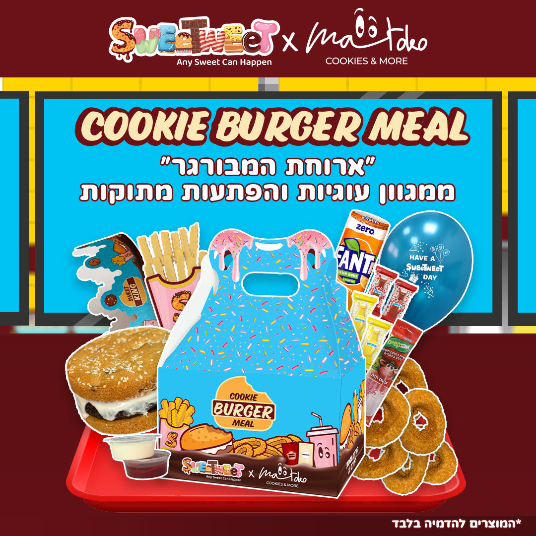 "ארוחת המבורגר" ממגוון עוגיות והפתעות מתוקות בשיתוף "מתוקו", בית ייצור לעוגיות וקינוחים מעולים בעבודת יד. יחד יצרנו את COOKIE BURGER MEAL - ארוחת של ממש שעשויה כולה מעוגיות! 🤩