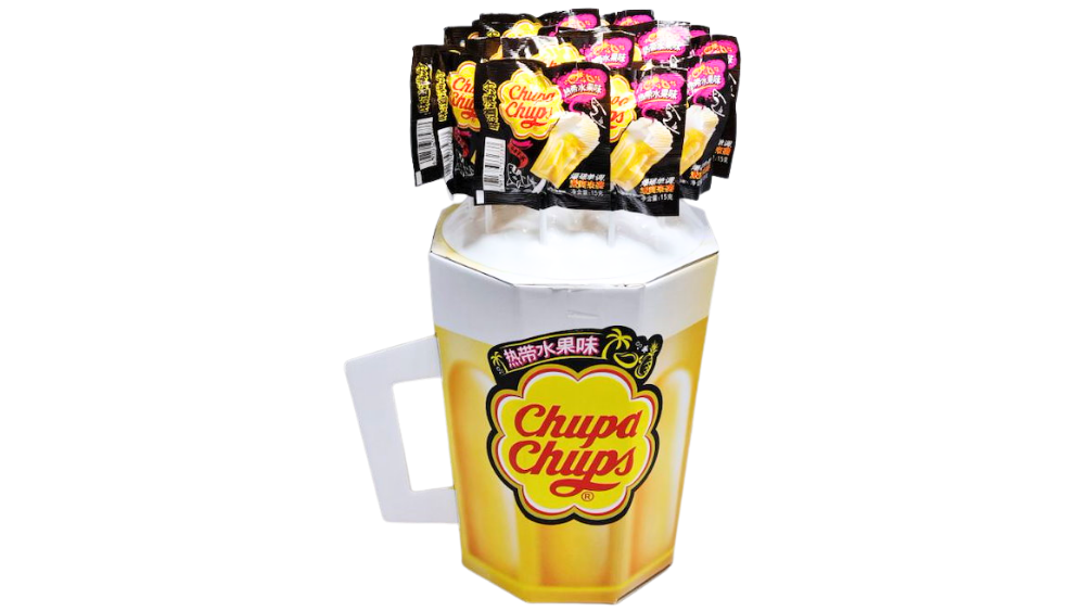 סוכריות על מקל בטעמי פירות של מותג הסוכריות האהוב צ'ופה צ'ופס המגיעות במארז מדהים ומתוק בעיצוב כוס בירה ענקית!