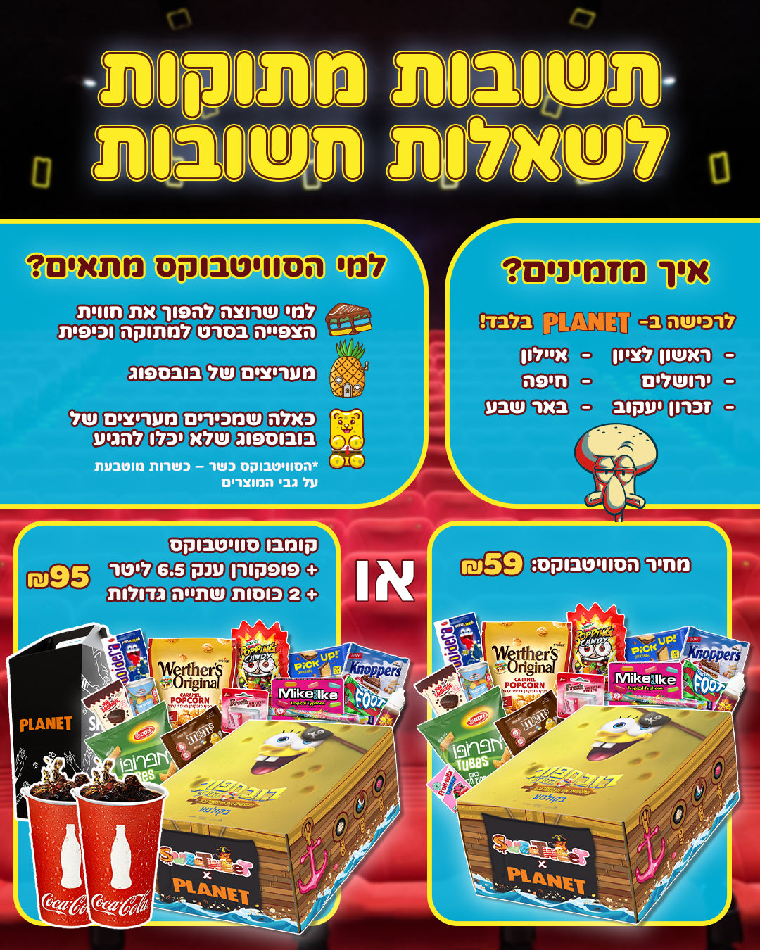 בשיתוף עם רשת בתי הקולנוע פלאנט 🧽🎁🎬הסוויטבוקס שילווה אתכם בצפייה בסרט "בובספוג הסרט: מחפשים את מכנסמרובע" בכל בתי הקולנוע של רשת PLANET במהדורה מוגבלת.