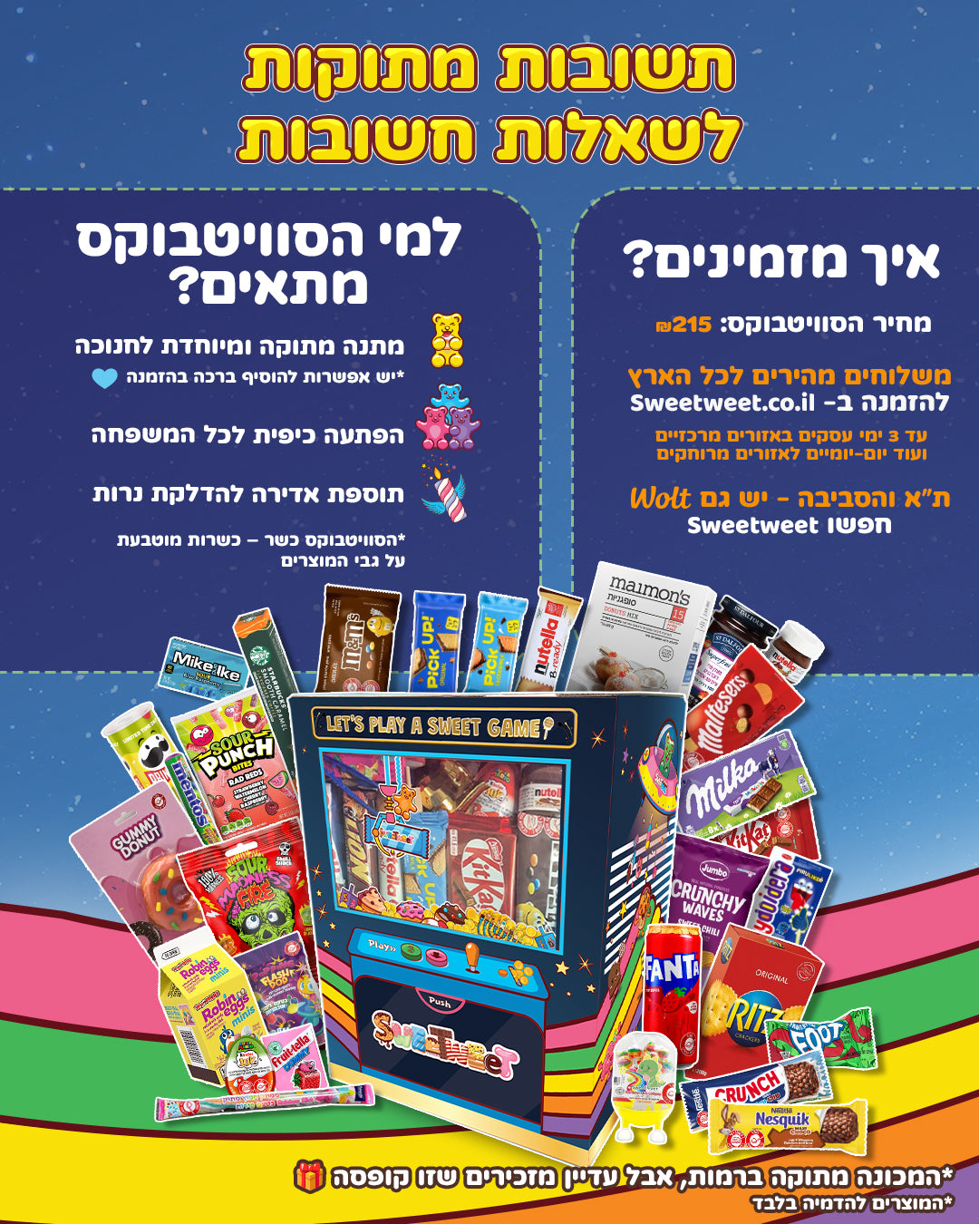 * ניתן להזמין את הסוויטבוקס גם במשלוח לאדם אהוב אחר ולצרף ברכה לפני ההוספה לעגלה, הקפידו למלא את פרטיו בסיום ההזמנה.