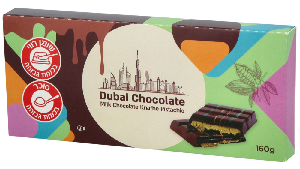 זהו ללא ספק השוקולד דובאי הכי טעים שטעמנו בחיינו! השוקולד יוצר בהשראת כנאפה מסורתי, שילוב של שיערות קדאיף פריך עם מילוי מחית פיסטוקים מפנק. אין טעים יותר מזה!
